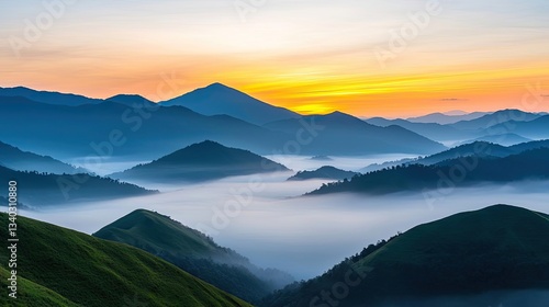 © Tin, Obraz premium Mountain range landscapes concept. Breathtaking sunrise over misty mountains, showcasing nature's serene beauty.