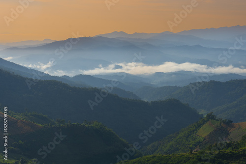 © somchairakin, Fototapeta premium Mountain range mist sunrise forest valley landscape peaceful nature scenic morning
