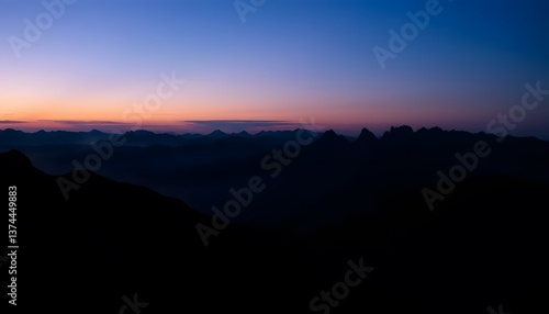© Day, Fototapeta premium Mountain Range Silhouette at Dusk with Soft Sunrise Hues