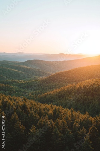 Fototapeta premium Mountain range with fore at sunset, with the sun setting behind them.