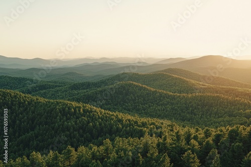 Naklejka premium Mountain range with fore at sunset, with the sun setting behind them.