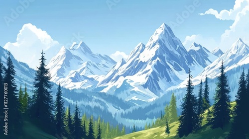 Obraz premium Mountain range with snow-capped peaks and pine forest, high altitude, crisp...
