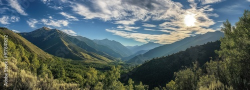 © Rere_Art151, Fototapeta premium Mountain Range with Sun Shining Through Clouds