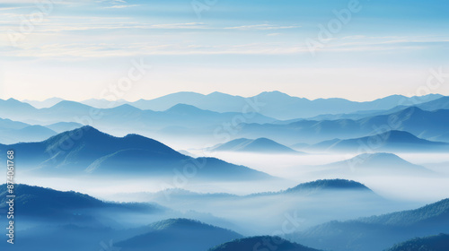 © Fang, Fototapeta premium Mountain range with visible silhouettes through the morning fog., generative ai