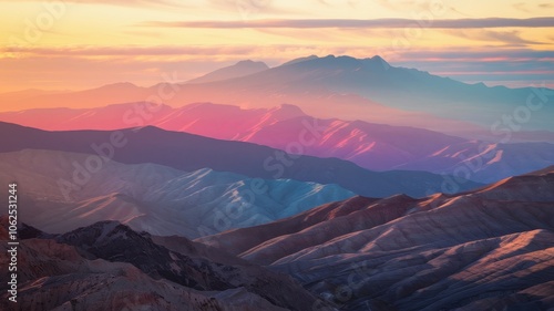 © Nemanja, Naklejka premium Mountain Range with Warm Gradient Sky at Sunrise or Sunset