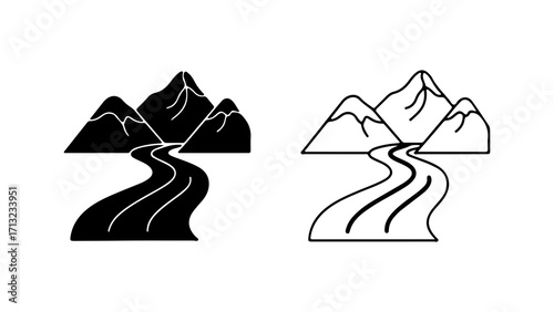 © Al, Obraz premium Mountain range with winding river vector icon set.