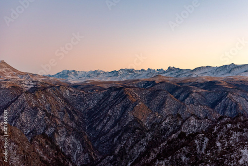 © Tatyana Obolevich, Fototapeta premium Mountain ranges at sunset in winter.