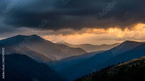 © kirania, Fototapeta premium Mountain ranges at sunset with dramatic clouds.