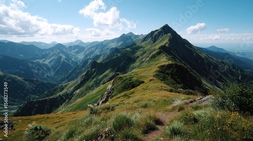 © zacty6, Fototapeta premium Mountain Ridge Path with Grassy Slopes and Distant Peaks