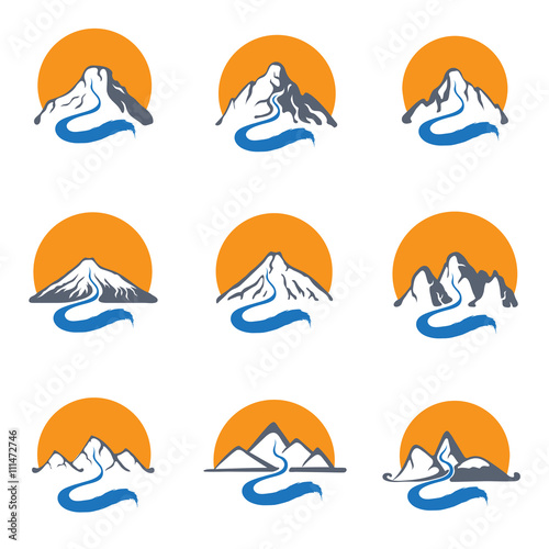 © Vasily Merkushev, Obraz premium Mountain river and sun, vector logo set illustration.