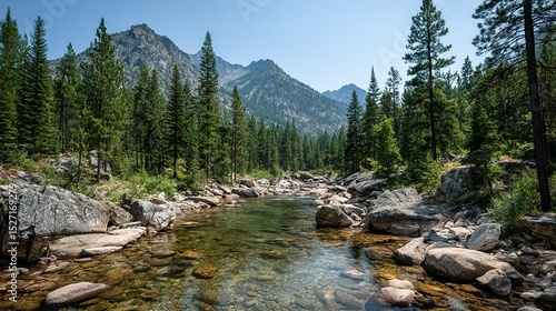 © Helens, Fototapeta premium Mountain river flowing through a lush forest.