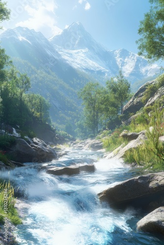 Fototapeta premium Mountain river flows through lush greenery beneath snow-capped peaks in vibrant sunlight