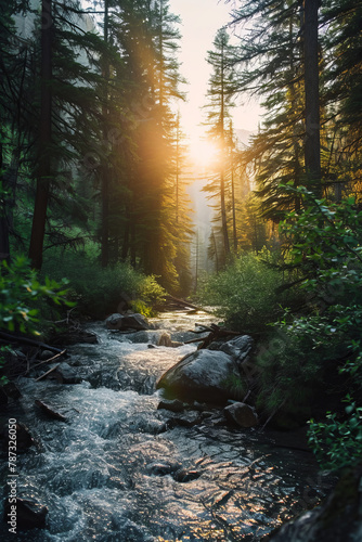 Obraz premium Mountain river, rapid water stream in a deep forest.