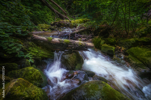 Naklejka premium Mountain river - stream flowing through thick green forest, Bistriski...