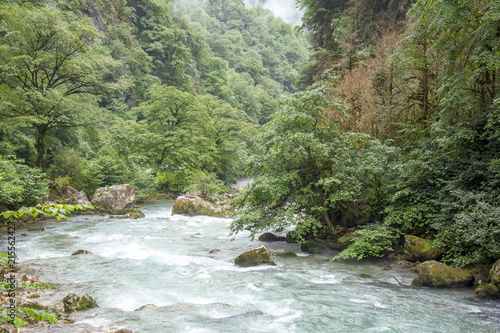 © leksann, Fototapeta premium mountain river with a strong current in the mountains