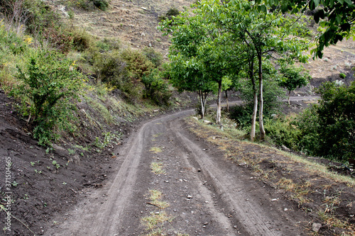 © Нажмудин Пирсаидов, Fototapeta premium Mountain road at sunset. Trees planted in the mountains. Highway in the mountains