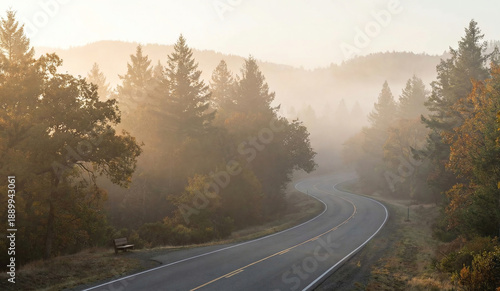 © Md. Farid Hossain, Fototapeta premium Mountain road in foggy landscape at sunset