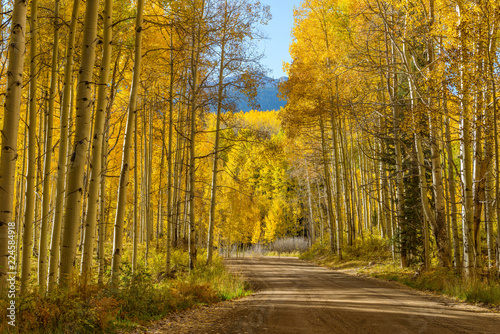 Obraz premium Mountain Road in Golden Aspen Grove - Autumn view of a mountain road winding through a dense aspen grove. Kebler Pass, Crested Butte, Colorado, USA.