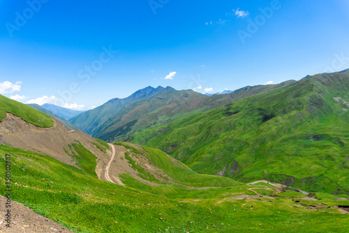 © Michael, Obraz premium Mountain road leading to the Datvisjvari pass. Mountains covered with green vegetation