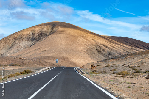 © barmalini, Fototapeta premium Mountain road on colourful remote basal hills and mountains of Massif of Betancuria, Fuerteventura, Canary islands, Spain
