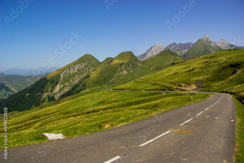 Fototapeta premium Mountain road surrounded by green meadows through the French Pyrenees
