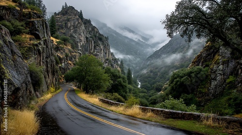 Fototapeta premium Mountain road winding through misty valley