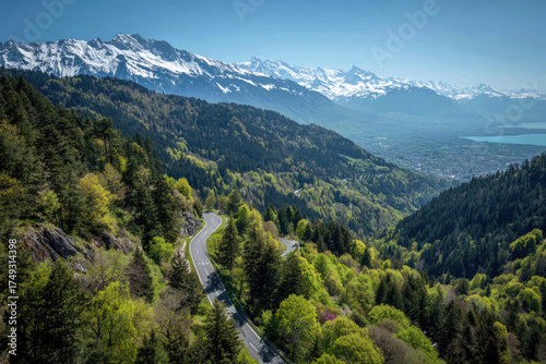 © Zulkifli, Obraz premium Mountain road winds through lush green valley, snowy peaks above