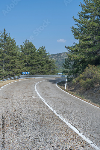 © Toyakisfoto.photos, Fototapeta premium Mountain road with banked curves descends between terraces. Natural terraced vegetation and eroded rock formations