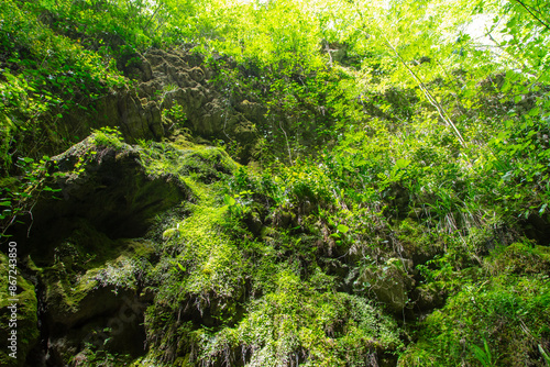 Fototapeta premium Mountain rocks in green vegetation as a background. Texture