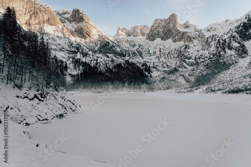 © Peter, Fototapeta premium Mountain scenery in the Alps with Dachstein summit reflecting in Lake Gosausee, Salzkammergut, Austria in the Winter