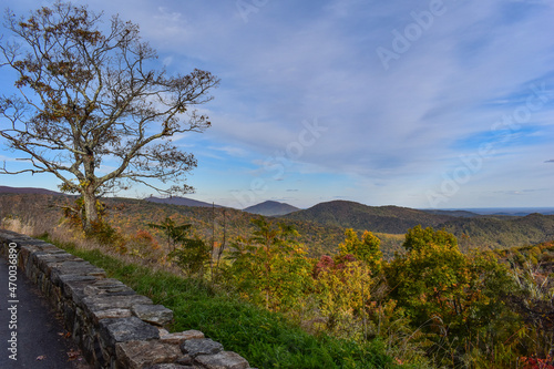 © JudithAnne, Obraz premium Mountain Scenery With Beautiful Fall Trees in the Foreground and a Bright Blue Sky in the Background