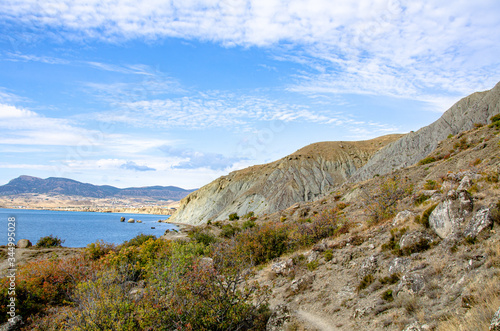 Fototapeta premium Mountain seascape, mountain vegetation and mountain trails on the coast.