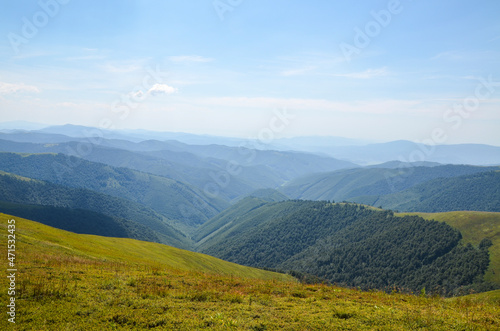 Naklejka premium Mountain slopes covered with dense green forest and blueberry fields in the sunlight. Ukrainian Carpathians in summer