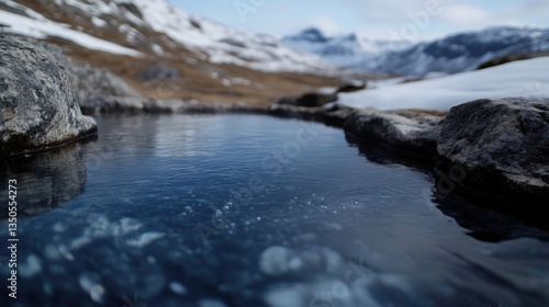 © SATRIANANGISAN, Obraz premium Mountain spring reflecting snowy peaks. Clear, tranquil water nestled within rocky terrain