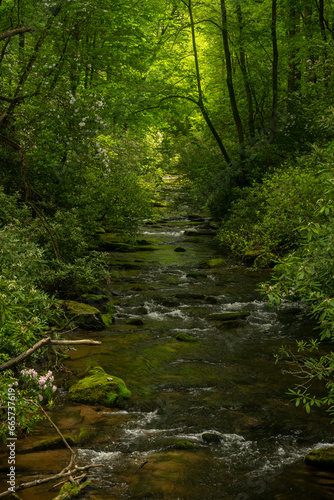 Obraz premium Mountain Stream Flows Through Bright Green Forest In South Carolina