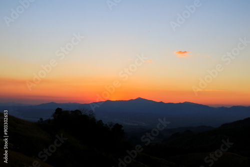 © Warunporn, Fototapeta premium Mountain sunrise landscape orange sky in the morning Amazing nature scenery. Tourism and travel concept