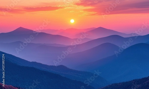 © badrun, Obraz premium Mountain Sunrise Panorama, Majestic Sunset, Misty Peaks, Peaceful Landscape