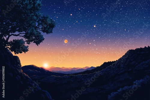 © Firmantio, Naklejka premium Mountain sunrise, starry night