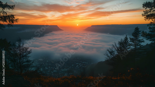 © susanti, Fototapeta premium Mountain Sunrise Valley Mist