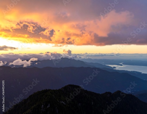 © Tini, Obraz premium Mountain sunrise, vibrant clouds, valley below