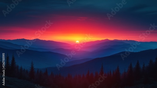 Obraz premium Mountain Sunrise, vibrant colors, silhouette trees, misty peaks