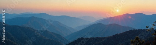 © Alvin, Fototapeta premium Mountain Sunset Landscape View, Hazy Sun Rays, Nature Scenic Image