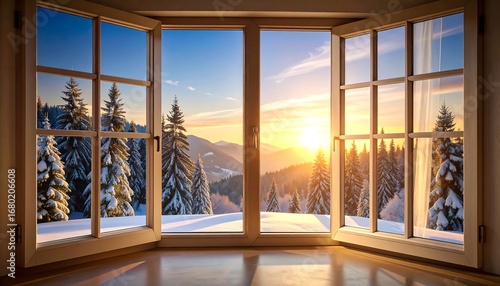 © Adobe, Fototapeta premium Mountain sunset viewed through open window, snow-covered pines