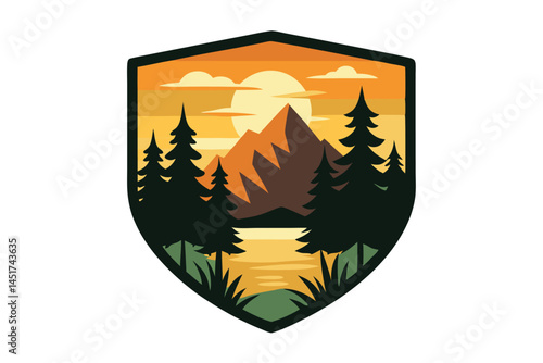 Obraz premium Mountain sunset within a shield has trees, grass and lake displayed vector