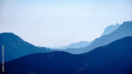 © Martins Vanags, Obraz premium mountain top panorama in autumn covered in mist or clouds