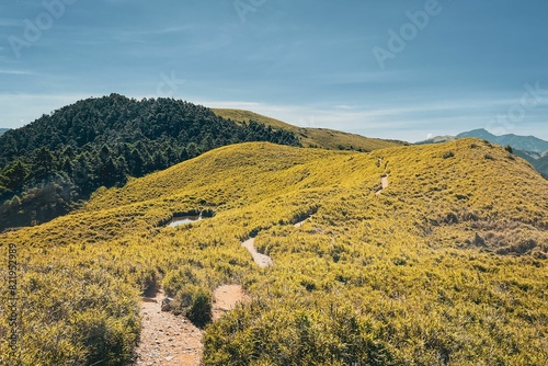 Fototapeta premium mountain trail going to the top of grassy area with hills in background
