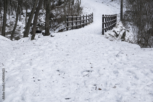 Naklejka premium Mountain trail path and bridge in a snowy landscape
