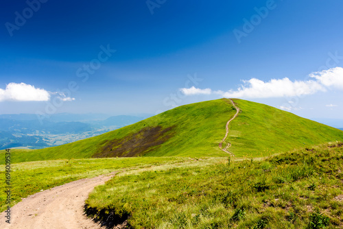Fototapeta premium mountain trail to the top of the summit. summer travel landscape under deep blue sky with fluffy clouds. sunny weather. borzhava ridge of transcarpathia, ukraine
