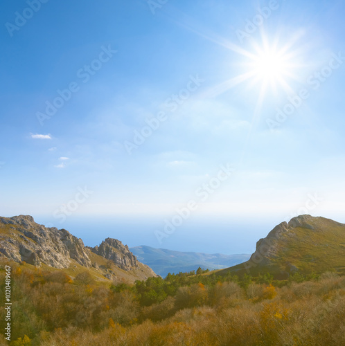 © Yuriy Kulik, Naklejka premium mountain valley at the bright sunny autumn day