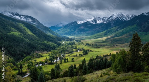Fototapeta premium Mountain valley bathed in soft light, under a dramatic sky. Lush green meadows, flowing river, and snow-capped peaks create a breathtaking panorama